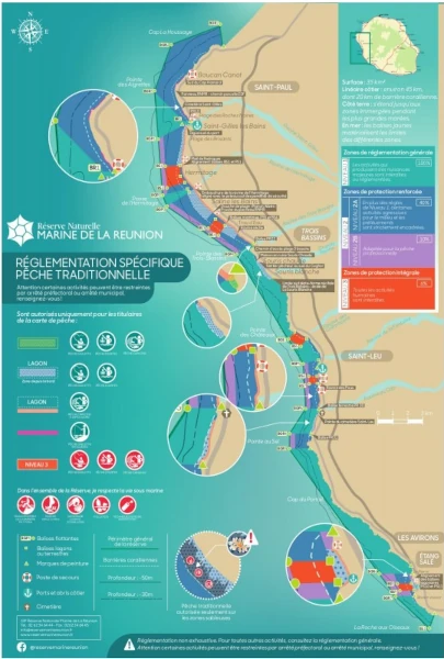 • Dans la Réserve nationale naturelle marine de la Réunion (RNNMR ou RNMR, cf. carte à droite) : pour les détenteurs d’une licence professionnelle de pêche délivrée par le CRPMEM de La Réunion. En zone de protection renforcée (ZPR), uniquement crabe girafe, capucin nain et à la traîne pour calmars et pélagiques ciblés. Interdiction de détenir toute forme de filet ou arme de pêche sous-marine en zone de protection renforcée (ZPR) ou zone de protection intégrale (ZPI) avec un maximum de captures de 5kg par pêcheur et par jour.